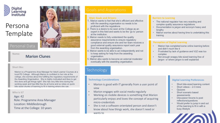 I used a persona template to create a ‘typical’ learner who needs this programme and this helped to formulate the direction of travel when it came to learning design.