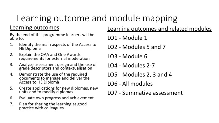 After the initial analysis, I developed a set of learning outcomes and mapped these to the seven modules I decided were necessary to ensure participants could demosntrate mastery.