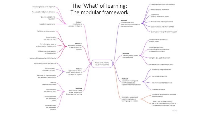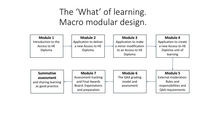 We began with the usual ADDIE approach and analysed the issue. I decided that a wholesale upskilling approach was needed and the training would be fully online and modular, but one where participants could choose whether they attempted all modules or just those they felt they needed or were directed to by the awarding organisation. Applying Mayer’s Principles, learning is carefully crafted to maximise accessibility for everyone and using Gagne’s 9 levels of instruction, learning is delivered, supported and assessed well. I ensured that there is both assessment for and of learning in the form of formative and summative assessments respectively.