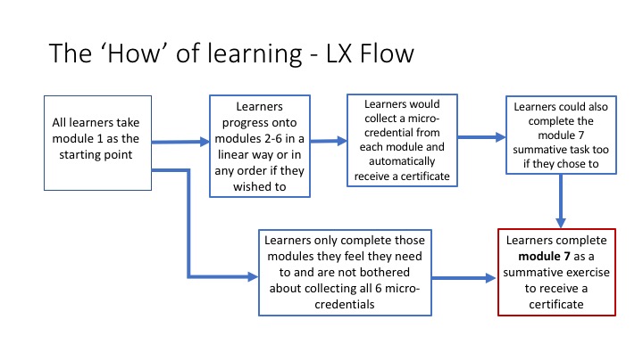 I decided to allow learners to decide how they attempted the modules on the course. So, after the mandatory 1st one, learners are free to choose which ones they complete depending upon their needs.